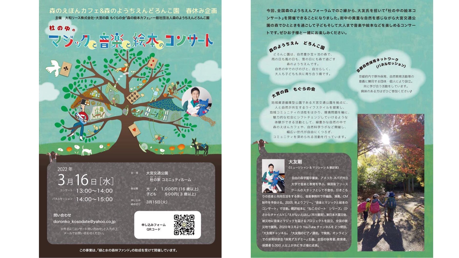 今回、全国森のようちえんフォーラムでのご縁から、大友氏を招いて『杜の中のえほんカフェコンサート」。を開催できることになりました。