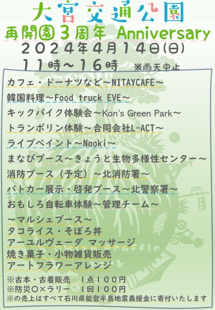 大宮交通公園が再開園3周年を迎えます♪みなさまへの感謝の気持ちを込めて公園関係者の力を集結して、ささやかながらイベントを開催いたします‼再開園3周年を迎える大宮交通公園で、お待ちしております✨ 2024年4月14日(日)11時~16時(予定... -