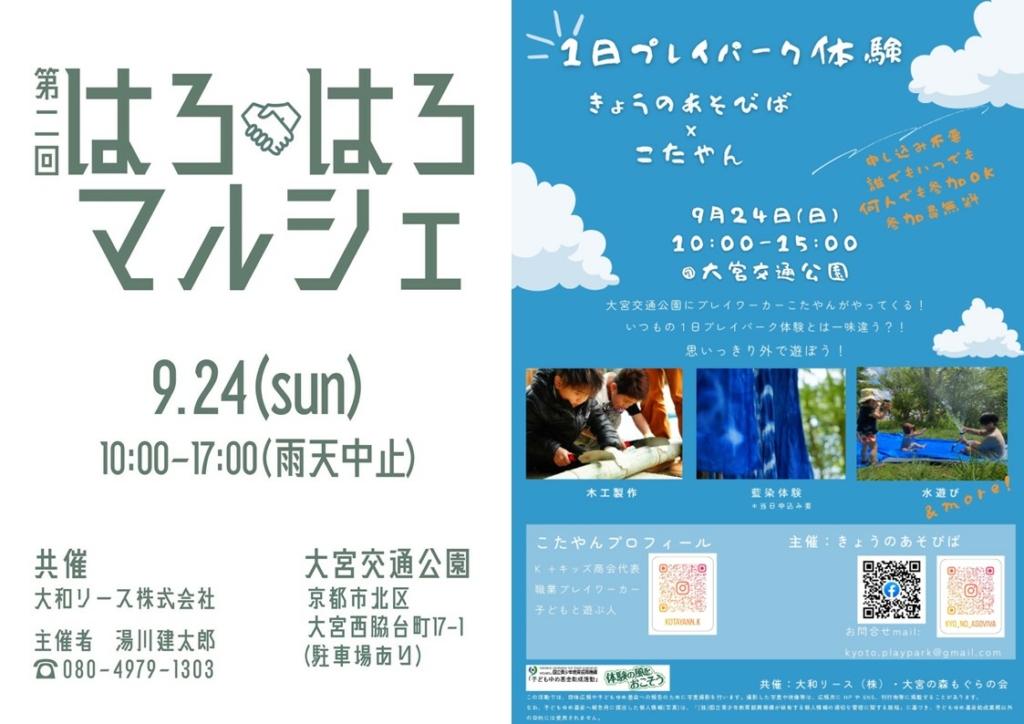 大宮交通公園で1日おもいっきり外で遊ぼう!!!この日はフードにワークショップと盛りだくさん♪ □2023年9月24日(日)□プレーパーク:10時~15時頃まで(主催:きょうのあそびば)はろはろマルシェ:10時~17時頃まで(主催者:湯川健太郎)【き... -