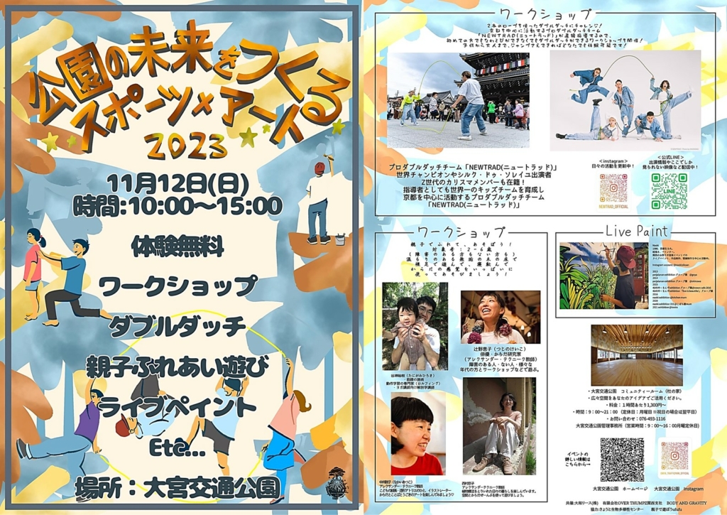 公園で新しい遊びを発見!?自然のなかで親子でできる遊びを発見!?公園の未来を描くライブアート!?いろいろなジャンルのプロが織りなすす「スポーツ×アート」な1日を秋の陽気とともにお届けします♪ 〇●2023年11月12日(日)10:00~15... -
